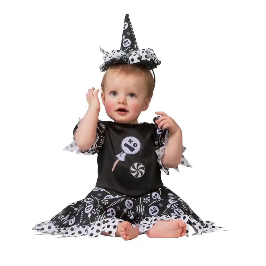 Votre petite fille sera forcément la sorcière la plus mignonne de la soirée dans la tenue de bébé sorcière imprimés bonbons.