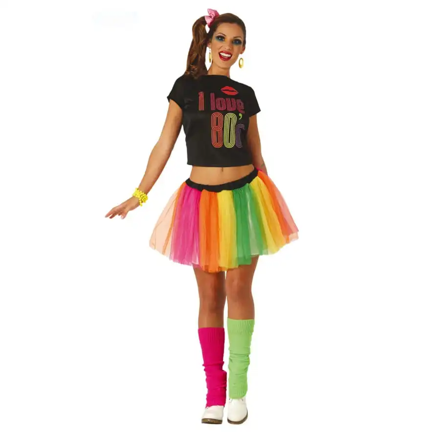 Offrez vous la tenue de danseuse disco avec tutu colorĂ© et devenez la sensation d’une soirĂ©e sur le thème des annĂ©es 80.