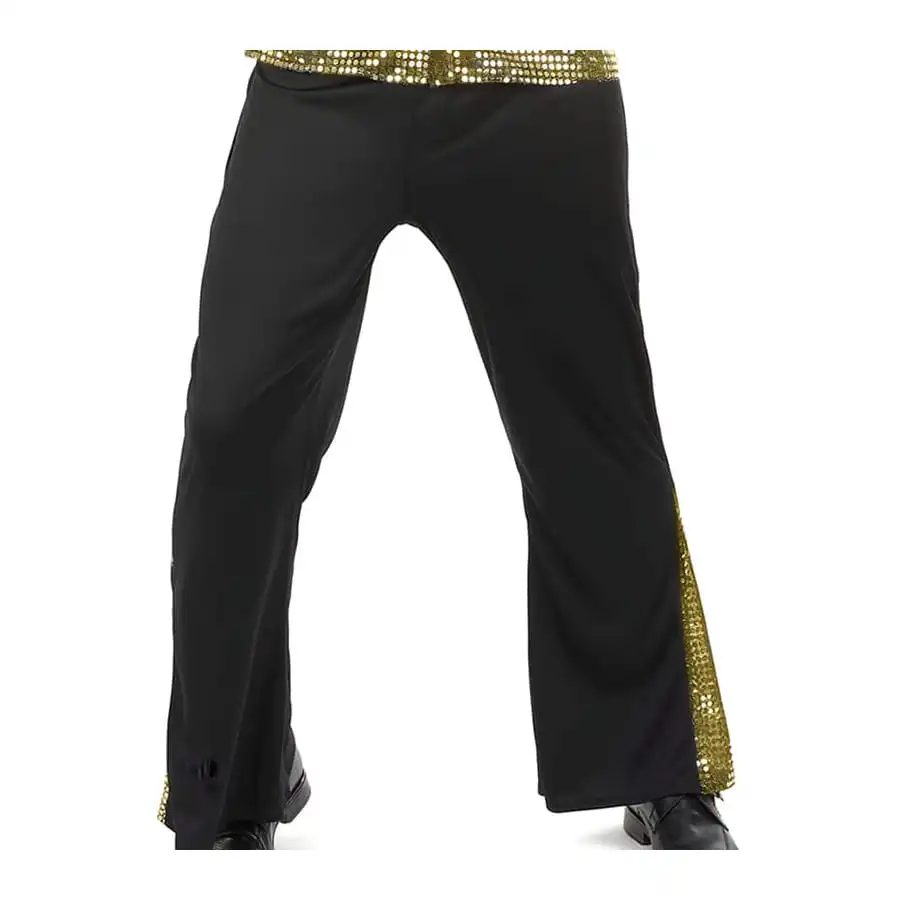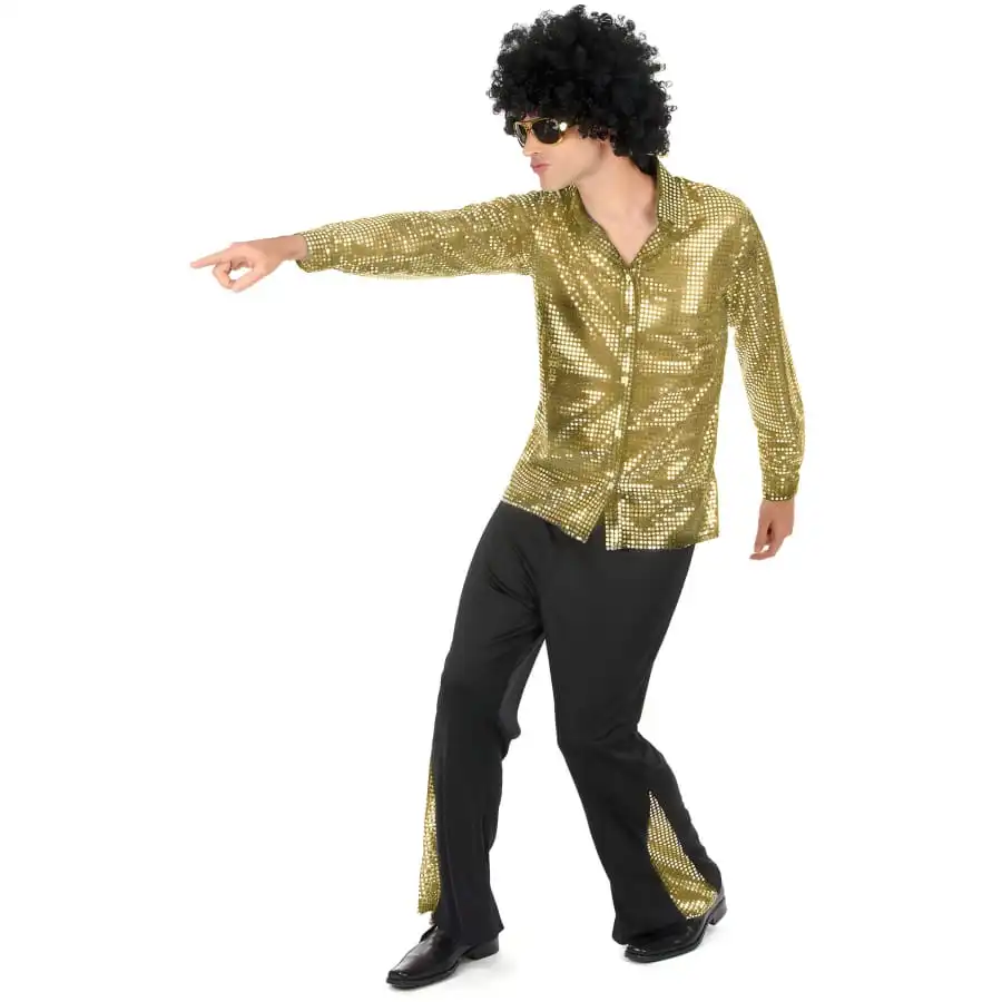 Cette tenue se compose d’une chemise dorĂ©e entièrement recouverte de sequins qui ajoutent un cĂ´tĂ© scintillant Ă votre look. La chemise se ferme grâce Ă des boutons sur le devant, vous assurant ainsi un confort et un maintien parfaits. Quant au pantalon noir, il est plus large dans le bas, offrant une coupe typique de l’Ă©poque disco, et il est dĂ©corĂ© d’une zone de sequins dorĂ©s sur les cĂ´tĂ©s pour rappeler la chemise.