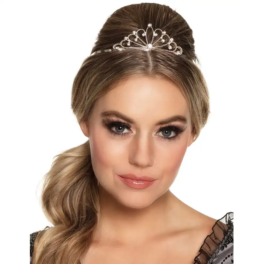 Cette tiare argentĂ©e avec effet diamant brillant pourrait parfaitement accessoiriser une tenue de princesses ou de fĂ©e lors d’une soirĂ©e Ă thème.