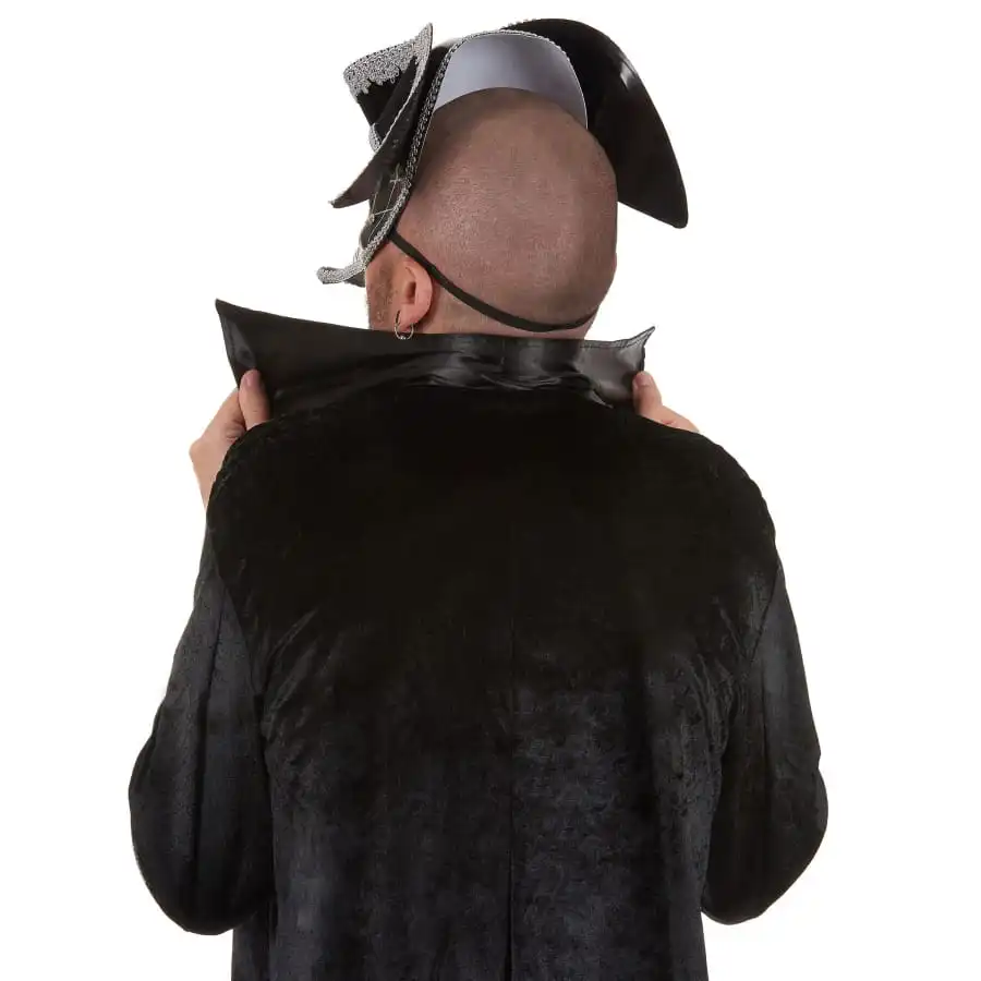 Un tricorne noir effet velours avec des liserés argentés est cousu directement sur ce loup et donne une illusion de 2 en 1.