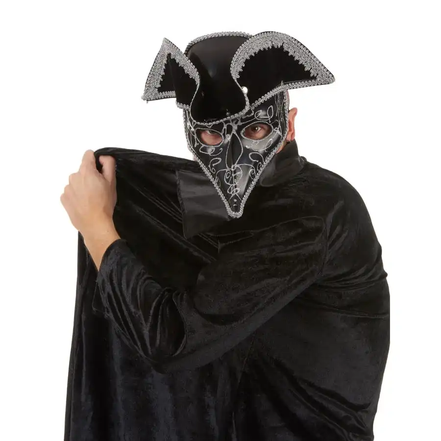 Soyez mystérieux lors de vos soirées déguisées grâce à ce Tricorne masque dr peste noir liserés argentés.